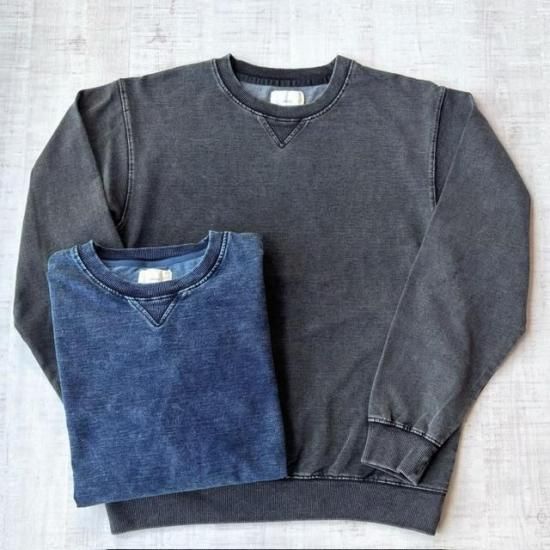生地は〈コットン80%/ポリエステル15%/ポリウレタン5%〉の裏毛を採用。スウェット地というよりはTシャツに近い薄手の生地で、インディゴ(もしくはブラックインディゴ)で製品染めをしたのちにケミカル加工を施し、ムラのある色落ちに仕上げています。
